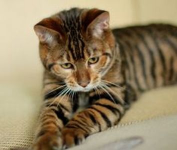 A Toyger's favorite pastime is to perch on the owner’s lap or stomach and, shifting from paw to paw, do a relaxing massage under his own background purr.