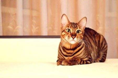 But do not confuse the loyalty and good nature of a Toyger with cowardice. These cats are quite brave creatures, which in combination with a natural curiosity, can lead to unpleasant consequences. In particular, flying from a balcony and through an open window, a showdown with dogs and relatives - all this is the result of feline courage, shown at the wrong time and in the wrong place.